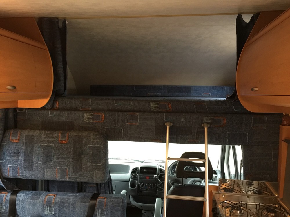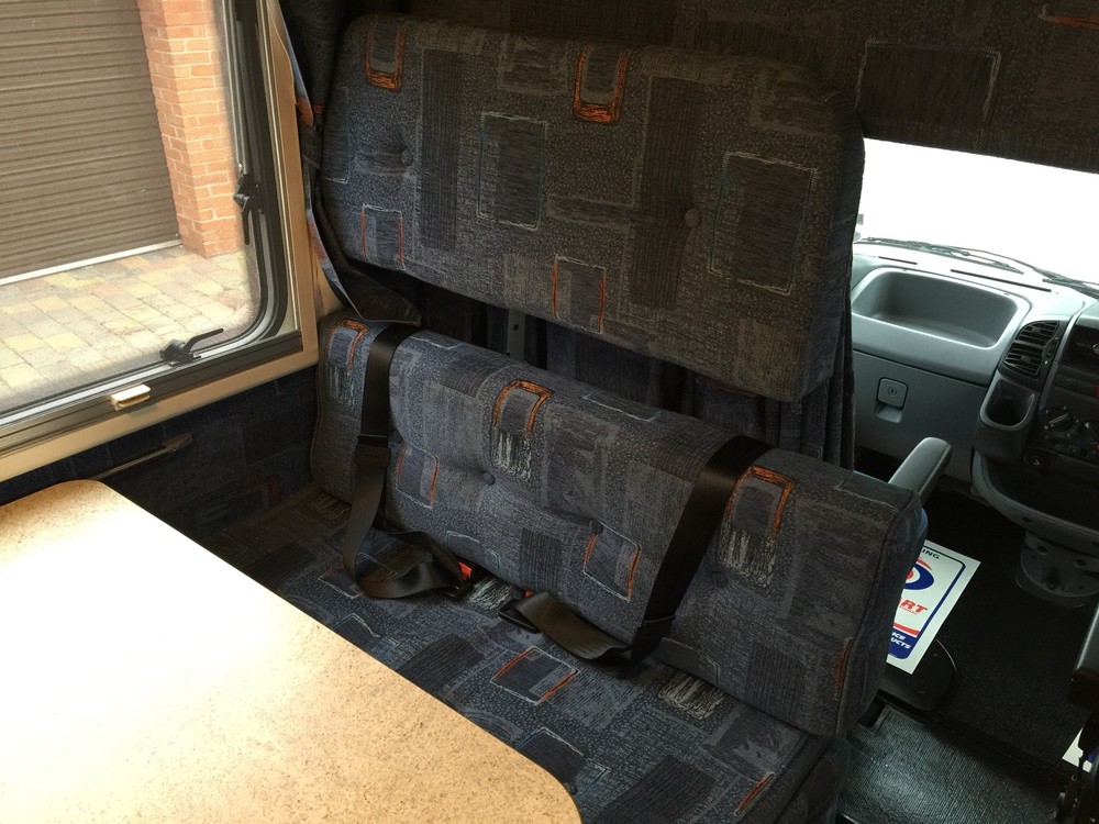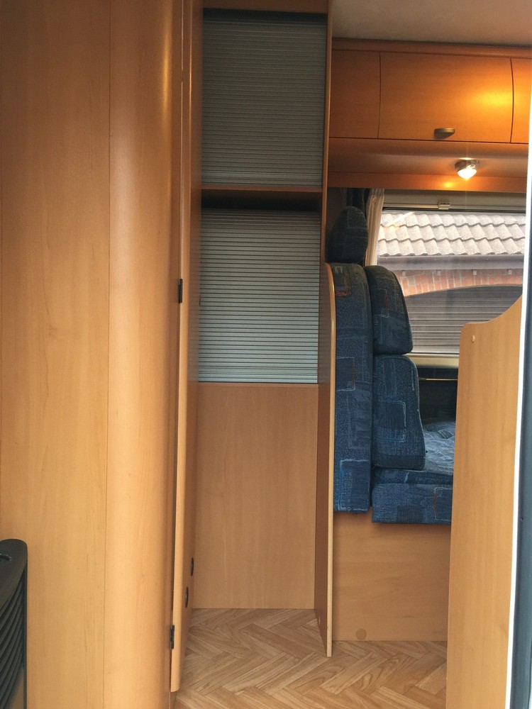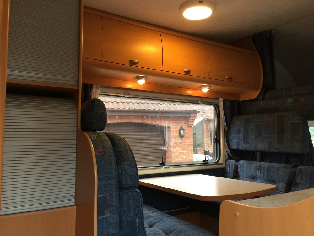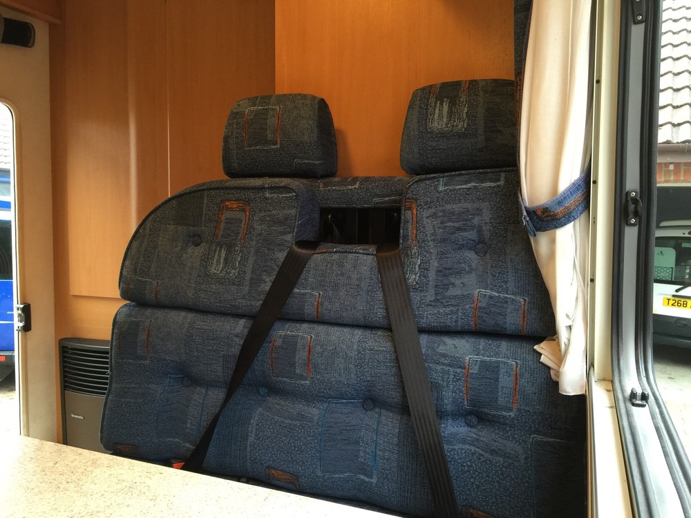 4 Berth, sleeps 2 above cab on a really huge double and 2 down below on the double sofas that turn into a respectable sized double bed. Trumatic gas heating, Truma hot water boiler, Dometic Power Fridge/freezer 12v/240v/gas, 4 ring Smev gas hob, gas grill, Fiamma wind out awning, large wet room to rear which includes a Thetford cassette toilet + hot/cold shower + sink with hot/cold tap and storage cupboards, Sony CD player with aux input, reversing camera with colour display in cab, Twin sofas both have 2 seat belts fitted (so you can carry 6 people in total!), 12v lighting, blinds/fly screens to windows, Fiamma power roof vent, Status TV aerial, fresh water tank, waste water tank, kitchen sink with hot/cold mixer tap. Incredible amount of storage space in cupboards etc.